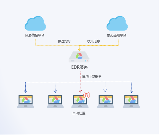 平臺(tái)針對(duì)安全風(fēng)險(xiǎn)較高的場(chǎng)景(如終端上報(bào)了高危安全事件,或觸發(fā)了特殊的安全策略)可以快速響應(yīng)并自動(dòng)下發(fā)處置措施,及時(shí)阻斷已知、未知或高級(jí)威脅,全面防護(hù)企業(yè)終端安全。
