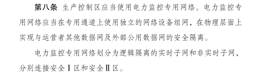? ? ? ? 其中第八條和第十條首次提出了邏輯隔離的概念,提到生產(chǎn)控制區(qū)應(yīng)當(dāng)使用電力監(jiān)控專用網(wǎng)絡(luò),劃分為邏輯隔離的實時子網(wǎng)和非實時子網(wǎng),分別連接安全Ⅰ區(qū)和安全Ⅱ區(qū);安全Ⅰ區(qū)與安全Ⅱ區(qū)之間、安全Ⅲ區(qū)與安全Ⅳ區(qū)之間、安全接入?yún)^(qū)與終端之間應(yīng)當(dāng)設(shè)置具有訪問控制功能的設(shè)備、防火墻或者相當(dāng)功能的邏輯隔離設(shè)施。