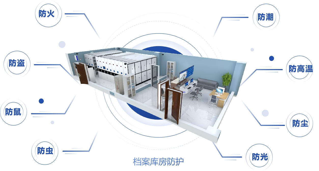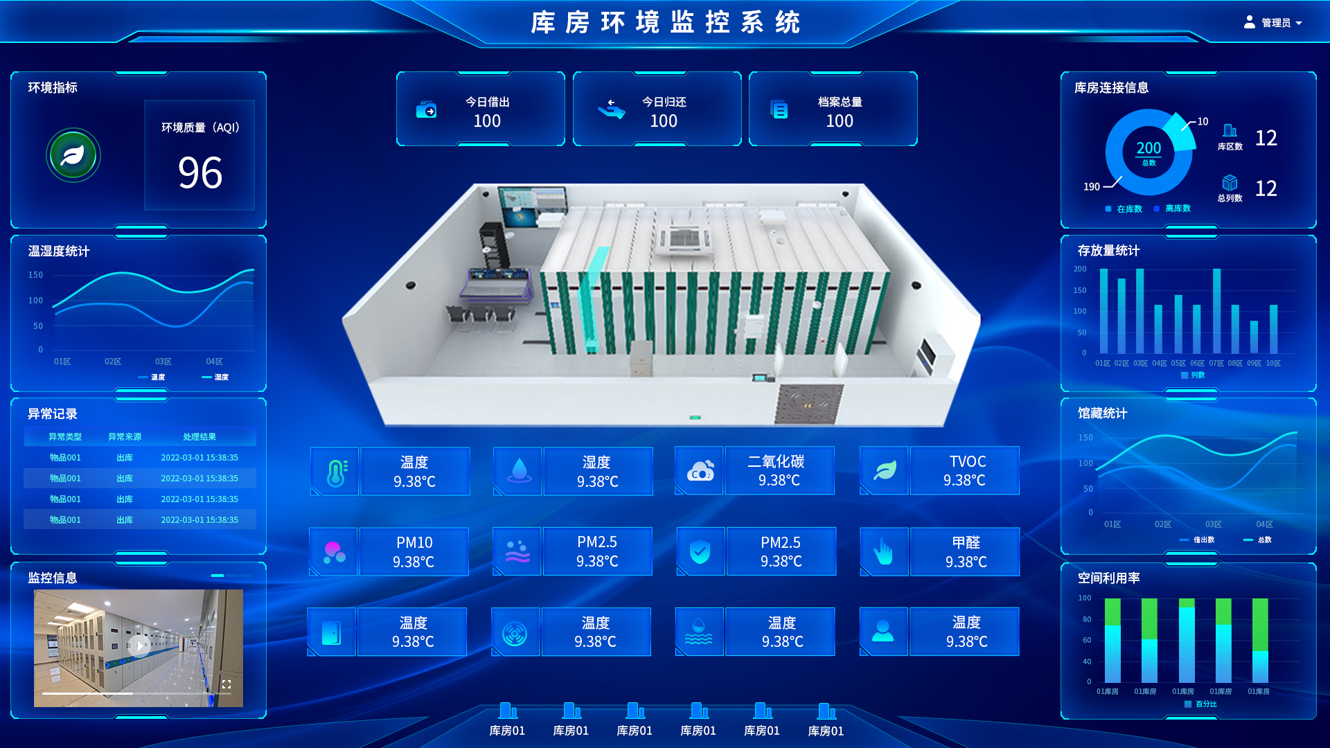 云涌科技智能環(huán)境控制綜合管理系統(tǒng)通過智能設備采集所有庫房內(nèi)的溫度、濕度、漏水、人員侵入等數(shù)據(jù),并通過自動模式控制空調(diào)、除濕加濕凈化一體機、電動窗簾、燈光、新風機等智能設備,達到自動調(diào)節(jié)溫濕度及空氣凈化的目的,實現(xiàn)了庫房內(nèi)空氣質(zhì)量的智能管理,保護了檔案本身安全和從業(yè)人員的身體健康。同時接入視頻監(jiān)控系統(tǒng),實時監(jiān)控檔案庫房實時內(nèi)畫面;出入口部署門禁控制設備,通過指紋、門禁卡、密碼等方式控制人員的進入,只有有權限的管理人員才能進入,有效保證檔案實體的安全。