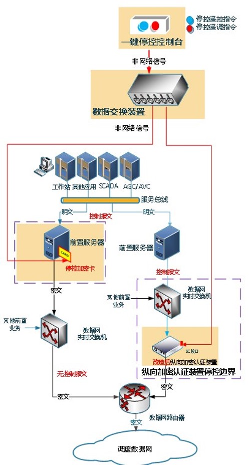 ??乜v向加密認證裝置:基于縱向加密認證裝置進行改造的新型裝置,具備識別控制臺指令,用于防止主站網(wǎng)絡安全事件的影響向廠站大規(guī)模蔓延,默認情況下處于縱向加密認證裝置的原有工作模式運行,緊急情況下可通過非網(wǎng)絡方式啟動阻斷模式運行,阻斷攔截主站下發(fā)廠站的遙控、遙調命令,以下簡稱“??乜v向裝置”。