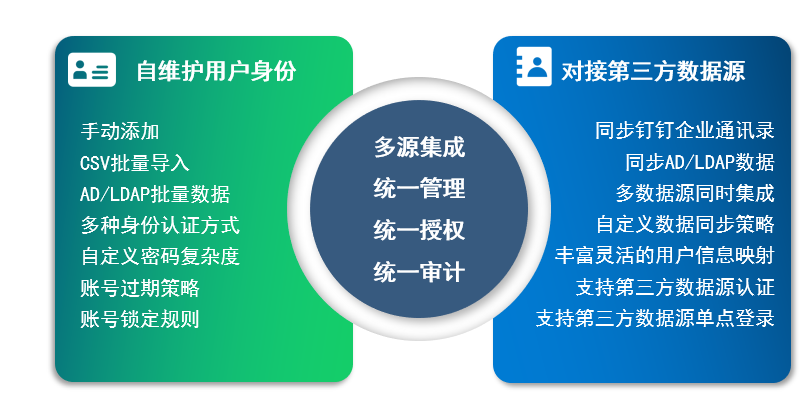 云涌零信任安全管理平臺既支持主流企業(yè)通訊錄系統(tǒng)的數(shù)據(jù)導入與同步,也支持自建用戶體系。實現(xiàn)了在一個平臺對企業(yè)人員、部門以及角色組的統(tǒng)一高效管理。同時系統(tǒng)提供多種用戶認證方式,全方位滿足各種需求場景。