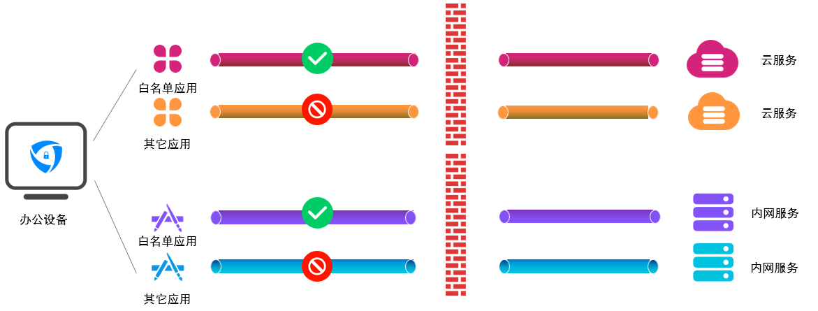 云涌零信任系統(tǒng)始終保證僅“合法”的本地應用才能訪問內網(wǎng)服務。只有經(jīng)過管理員授權的應用進程才可以通過TLS隧道傳輸數(shù)據(jù)。系統(tǒng)將應用與服務綁定,提高服務訪問的安全性。