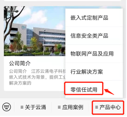 首先關(guān)注云涌科技官方微信公眾號(hào),然后進(jìn)入【產(chǎn)品中心】菜單,并點(diǎn)擊下拉菜單中的【零信任試用】進(jìn)入試用頁面,點(diǎn)擊免費(fèi)試用根據(jù)提示操作即可。