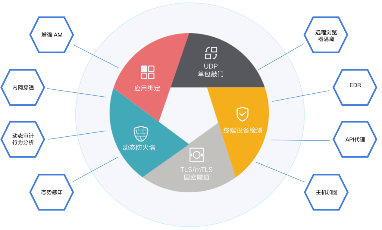 ? ? ? 本方案融合了當前最新的安全技術通過聯(lián)動的安全矩陣設計,形成一個整體的安全閉環(huán)。安全矩陣主要包括:SDP安全框架,遠程瀏覽器隔離,增強IAM, 端點檢測與響應EDR,邊緣微隔離,內網(wǎng)穿透,動態(tài)審計與行為分析,態(tài)勢感知,API代理、主機加固與可信計算。