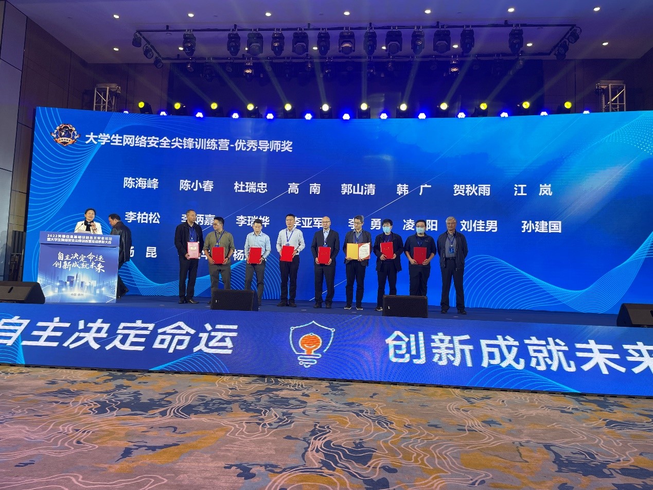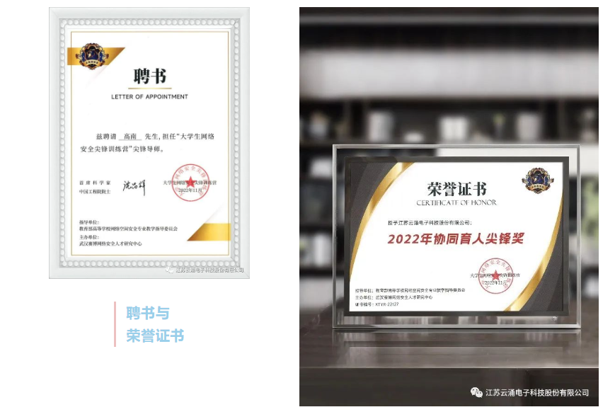 在大學(xué)生網(wǎng)絡(luò)安全尖鋒訓(xùn)練營(yíng)2022年度總結(jié)表彰儀式上,公司董事長(zhǎng)高南先生榮獲優(yōu)秀尖峰導(dǎo)師獎(jiǎng),云涌科技榮獲2022協(xié)同育人尖峰獎(jiǎng)。