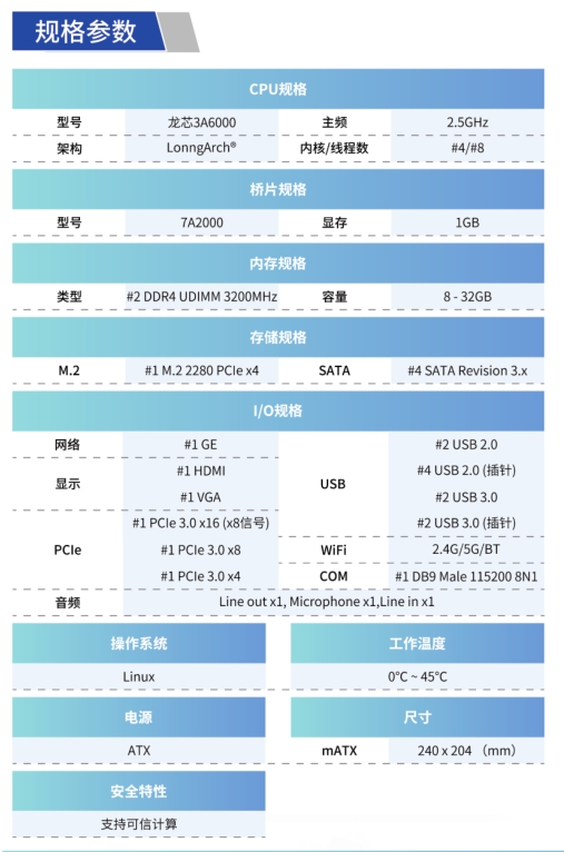 由云涌科技推出的基于3A6000的系列產(chǎn)品,采用4核處理器構(gòu)建,主頻2.5GHzo,搭配7A2000橋片,1GB獨(dú)立顯存,支持2路UDIMM3200DDR4內(nèi)存條,支持M.2接口,可作為小容量固態(tài)系統(tǒng)盤使用,應(yīng)用于家用娛樂、商務(wù)辦公等場(chǎng)景。