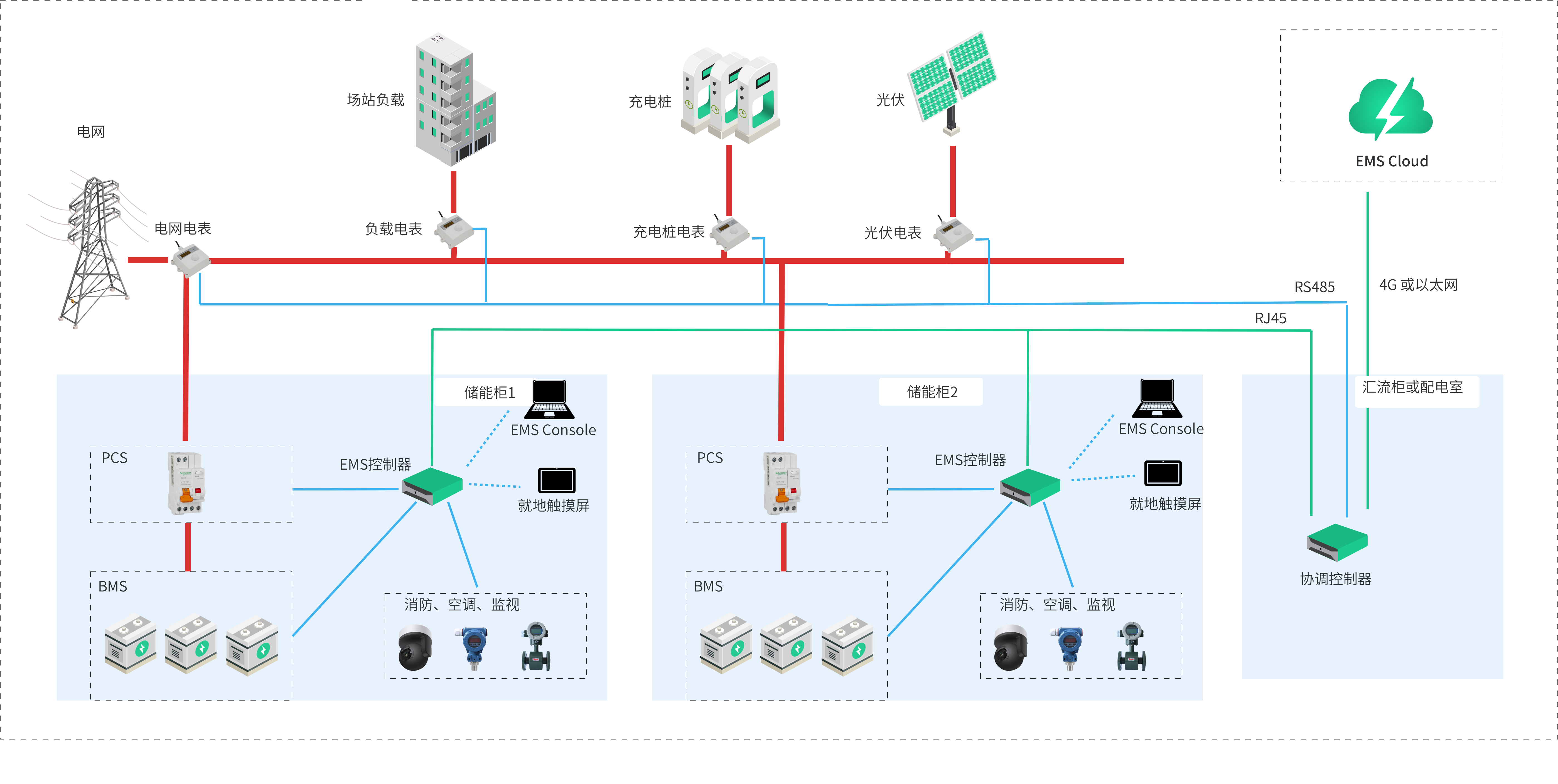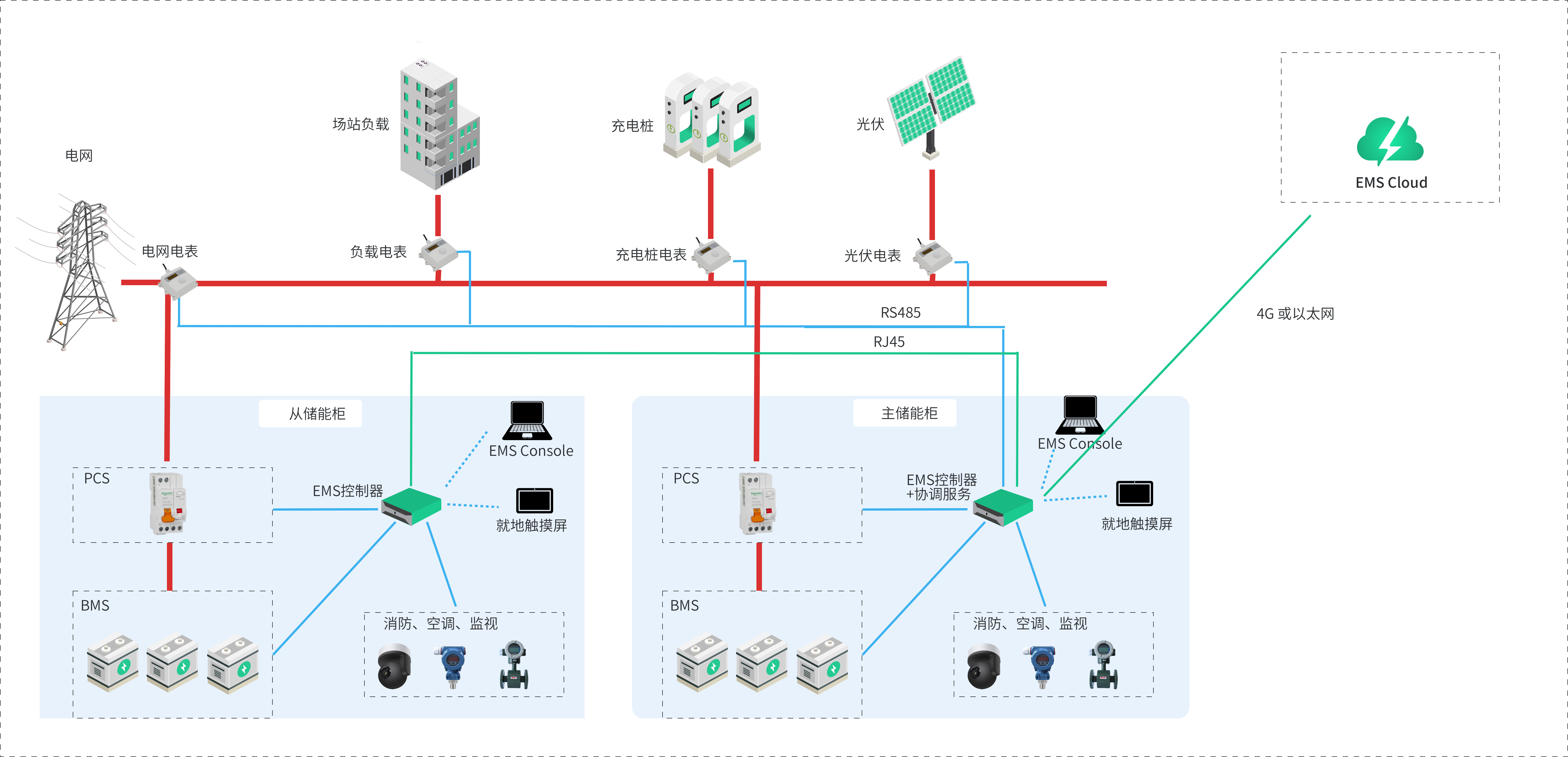 所有柜體內只有一個控制器,并放置于主柜中,主柜EMS控制器通過以太網與所有從柜進行通訊交互,從柜中安裝采集或者轉換裝置,用于在主柜控制器與從柜各組件設備之間做數(shù)據(jù)轉發(fā)。