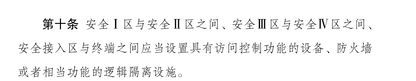 ? ? ? ? 其中第八條和第十條首次提出了邏輯隔離的概念,提到生產(chǎn)控制區(qū)應(yīng)當(dāng)使用電力監(jiān)控專用網(wǎng)絡(luò),劃分為邏輯隔離的實時子網(wǎng)和非實時子網(wǎng),分別連接安全Ⅰ區(qū)和安全Ⅱ區(qū);安全Ⅰ區(qū)與安全Ⅱ區(qū)之間、安全Ⅲ區(qū)與安全Ⅳ區(qū)之間、安全接入?yún)^(qū)與終端之間應(yīng)當(dāng)設(shè)置具有訪問控制功能的設(shè)備、防火墻或者相當(dāng)功能的邏輯隔離設(shè)施。