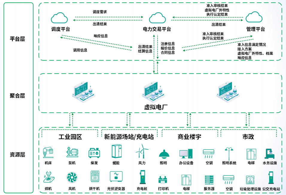 公司是泰州“首家”完成虛擬電廠注冊(cè)的企業(yè),虛擬電廠作為一種智慧能源管理系統(tǒng),被稱為能源產(chǎn)業(yè)鏈的“最后一公里“,其核心是將分布式的發(fā)電設(shè)備、儲(chǔ)能系統(tǒng)、電動(dòng)汽車(chē)、可調(diào)節(jié)負(fù)荷等資源聚合起來(lái),通過(guò)智能算法和通信技術(shù)統(tǒng)一調(diào)度,使其能夠像傳統(tǒng)發(fā)電廠一樣參與電力市場(chǎng)交易或響應(yīng)電網(wǎng)需求,從宏觀層面上,實(shí)現(xiàn)能源的高效利用和電網(wǎng)穩(wěn)定運(yùn)行。