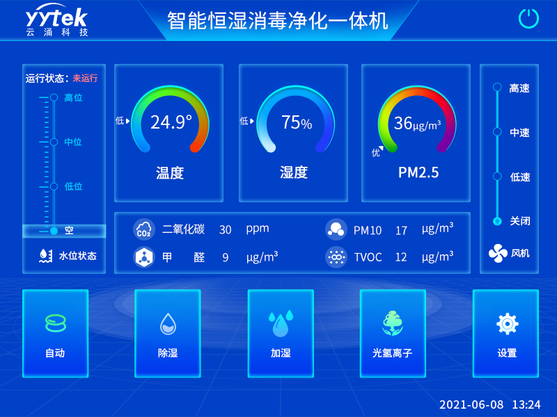 ? ? ? 此外,云涌智能恒濕消毒凈化一體機還具備智能化、人性化、直觀化的運行方式及操作體驗,運用微電腦智能控制技術(shù),全中文液晶觸控屏,功能模塊化設(shè)計等,搭配遠程監(jiān)控系統(tǒng),實時智慧感知分析預(yù)制故障;同時,設(shè)備自身配有大容量的內(nèi)置雙層水箱,實現(xiàn)雙重防漏保護,結(jié)合配備的缺水、水滿、溢水漏水報警系統(tǒng),用戶可通過人工加水和自動加水兩種可選方式,使整個設(shè)備在使用過程中更加安全便捷。
