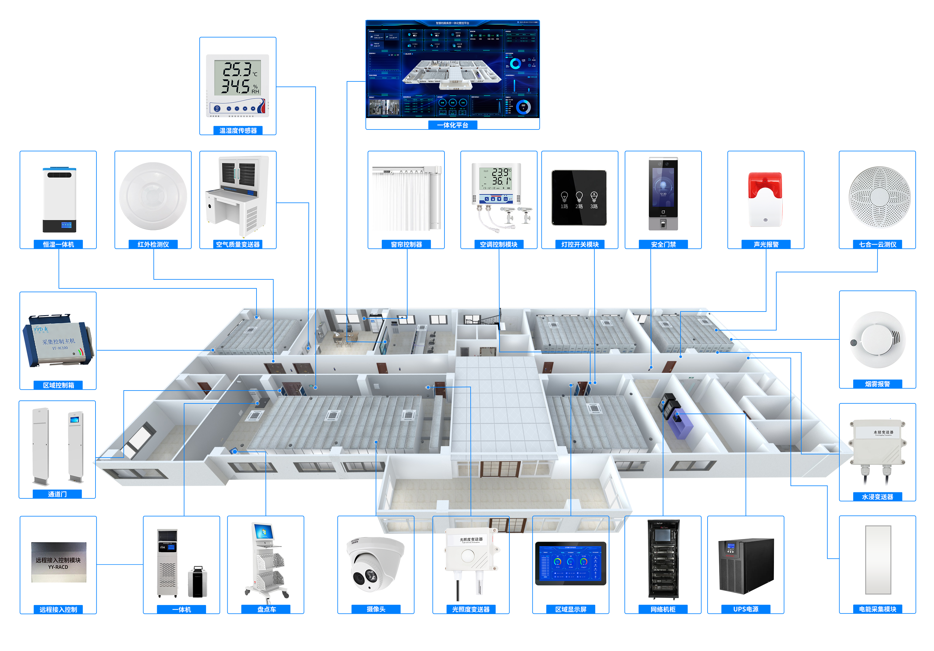 采集所有檔案室內(nèi)的溫度、濕度、漏水、煙霧、空氣質(zhì)量、人員侵入等數(shù)據(jù),并能夠通過控制空調(diào)、凈化一體機(jī)等設(shè)備,達(dá)到自動(dòng)調(diào)節(jié)溫濕度及空氣凈化的目的。